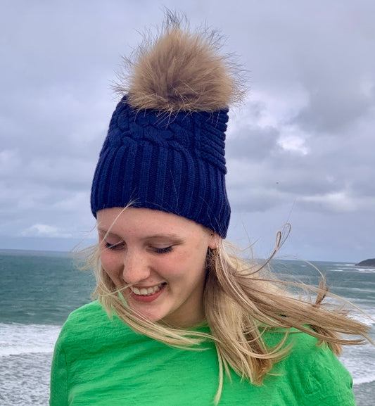 UP for ANYTHING 100% Pure Merino Wool Jumbo Cable & Fancy Rib Beanie with detachable Raccoon Fur Pom Pom, Dark Denim Blue